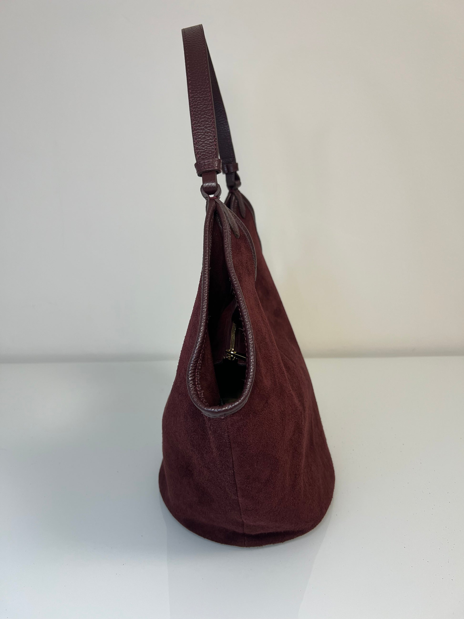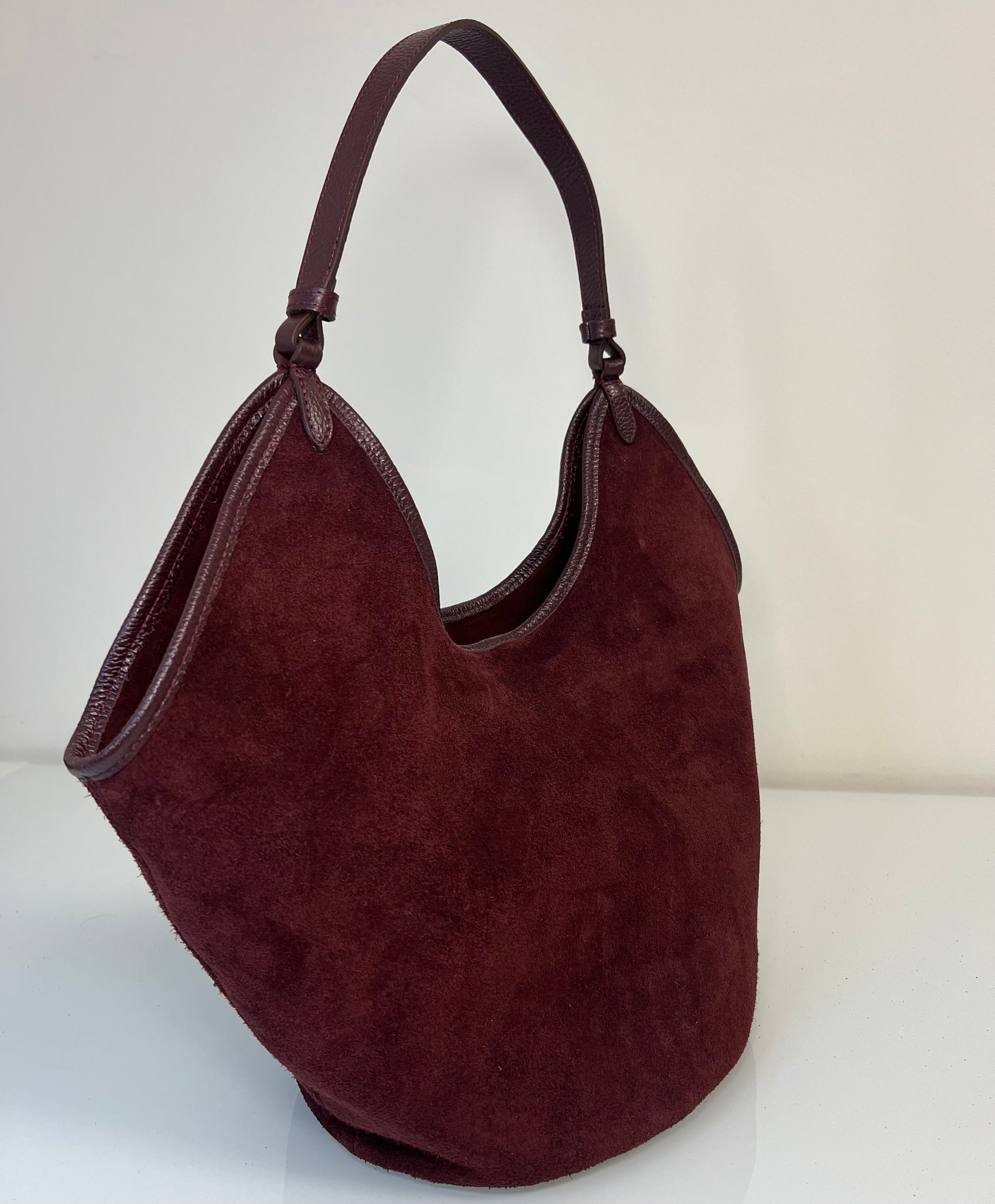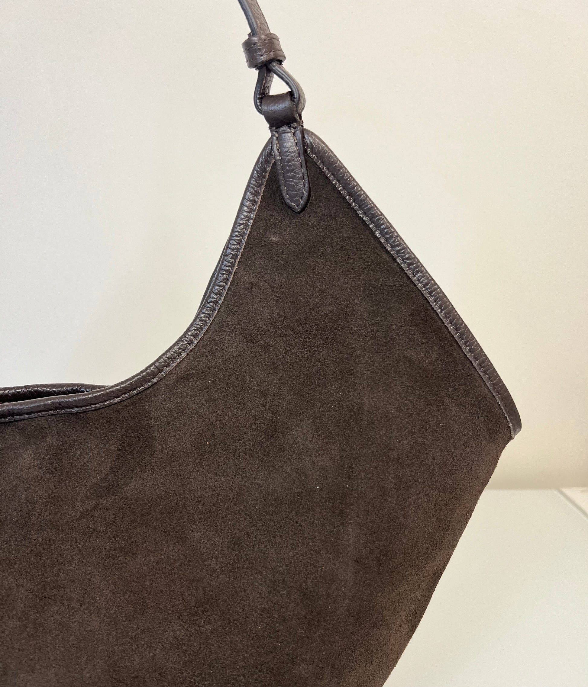 Dal design morbido e contemporaneo, questa borsa hobo in pelle scamosciata è l’alleata perfetta per un look chic e rilassato.