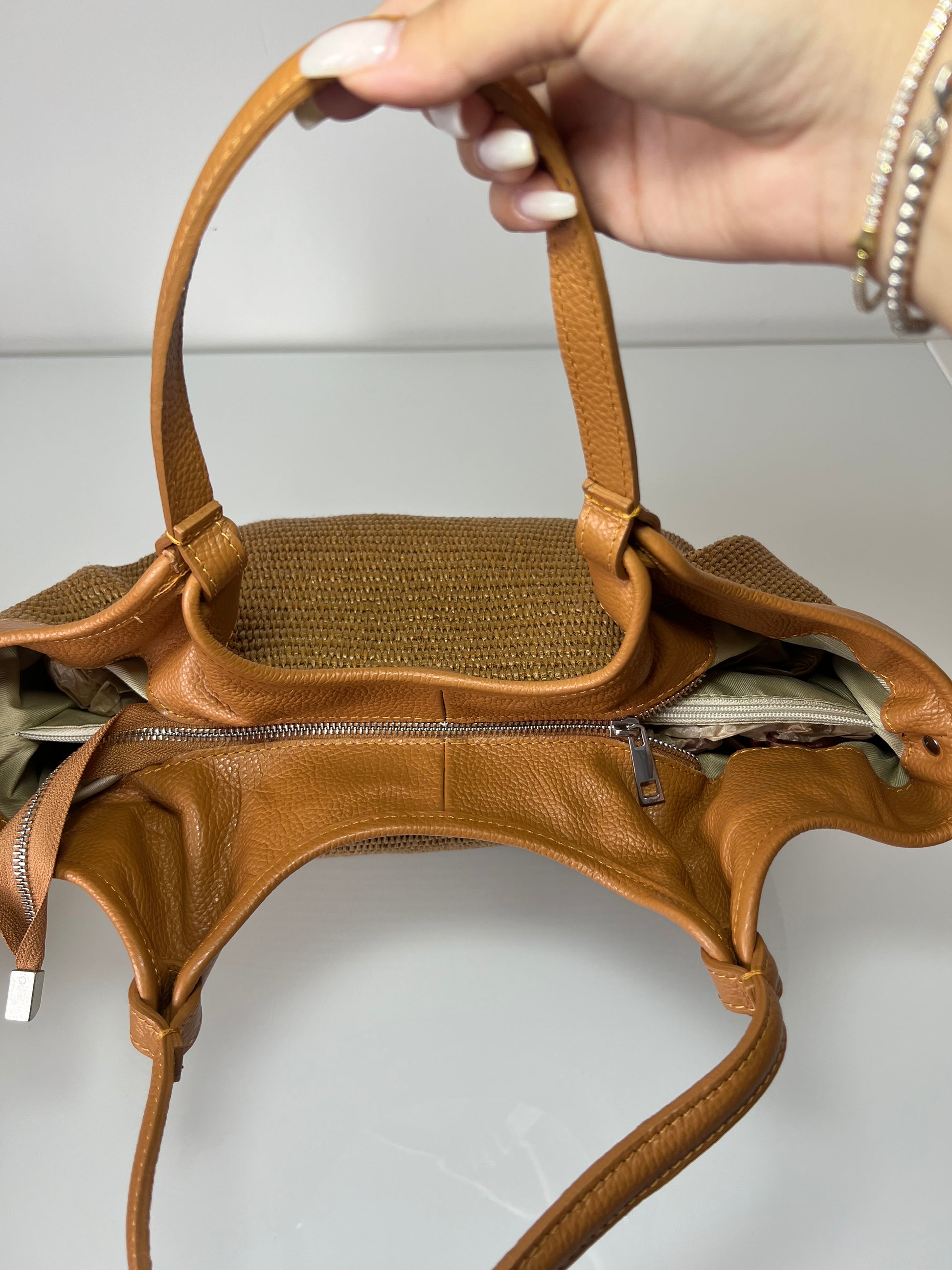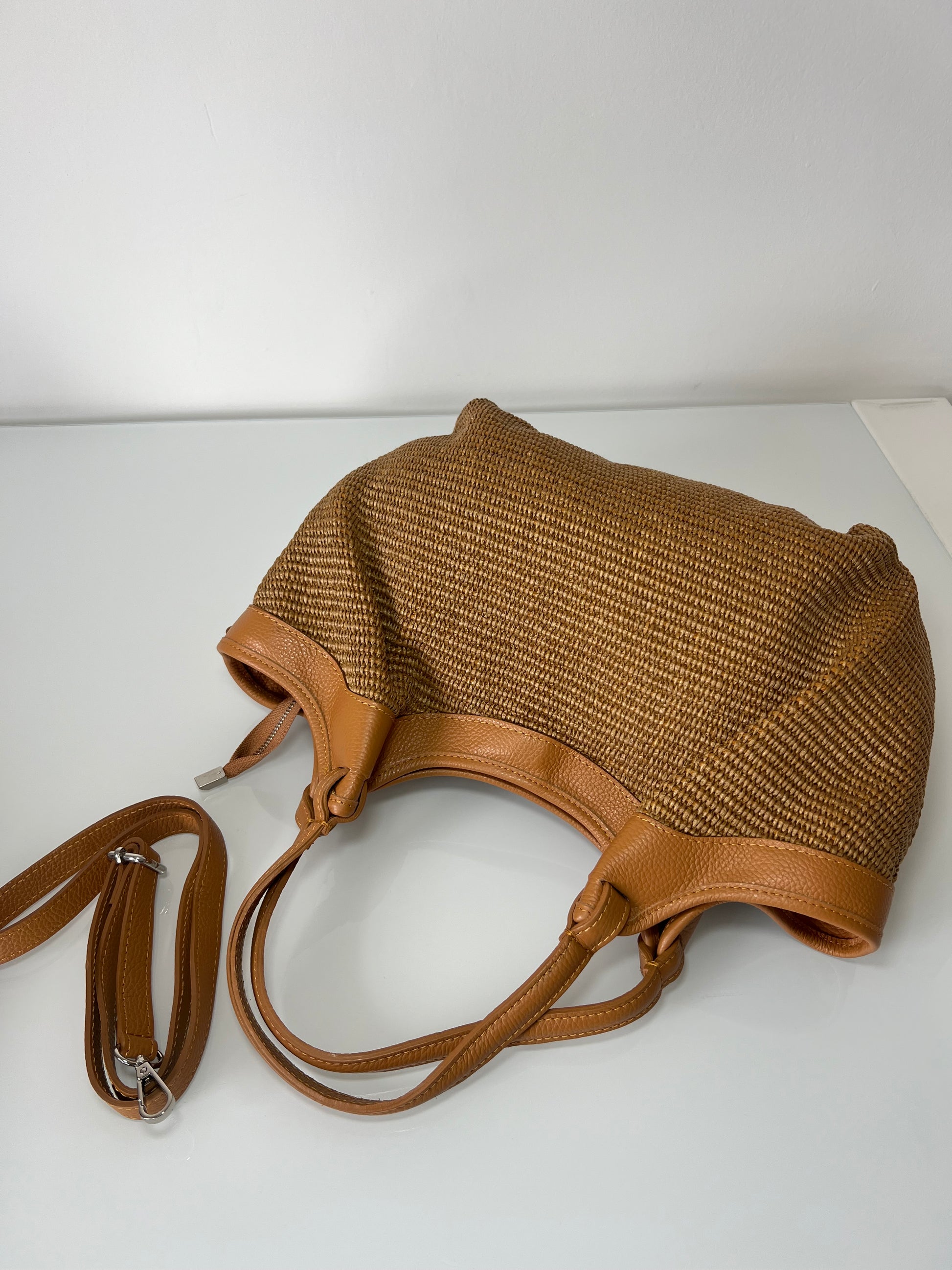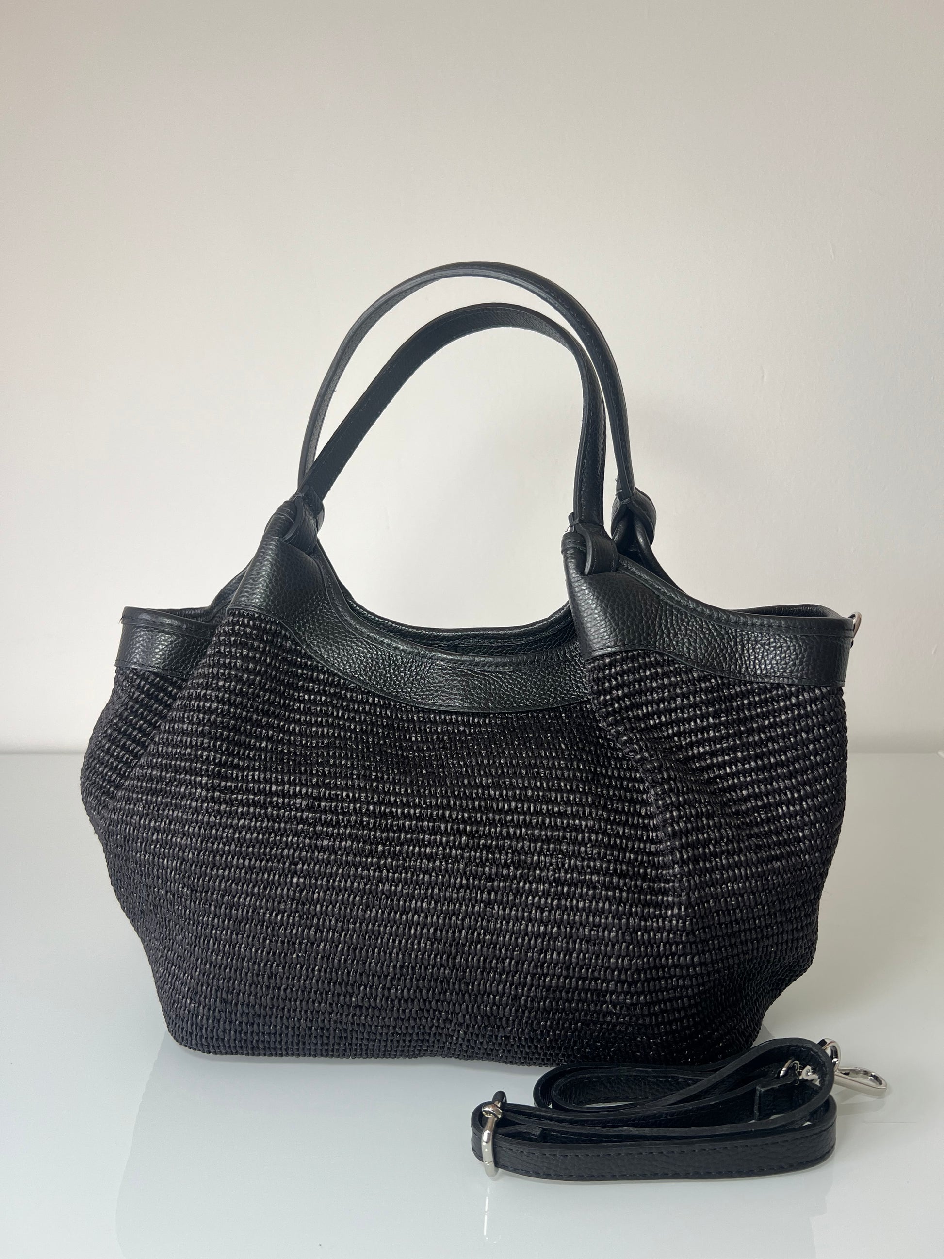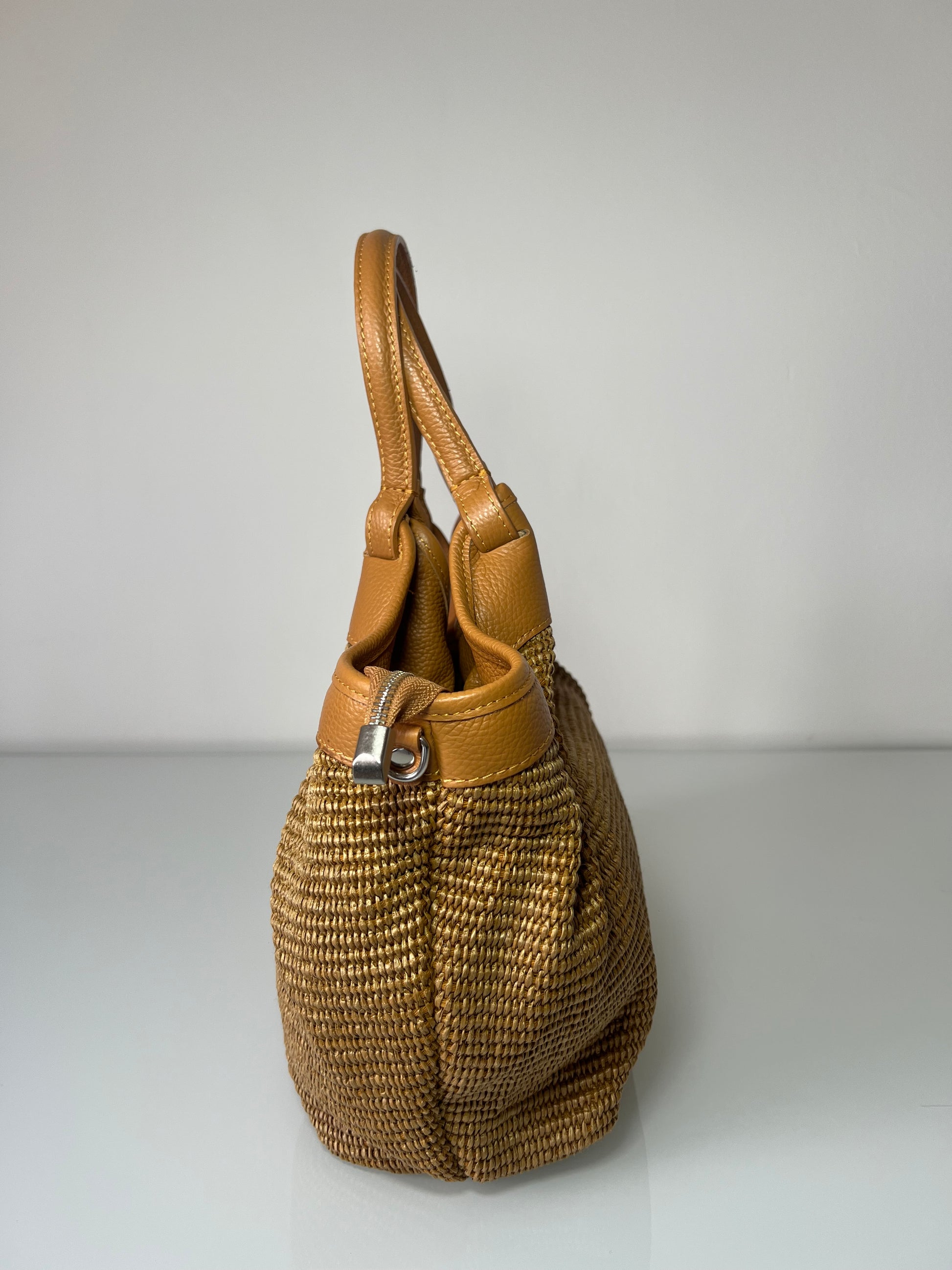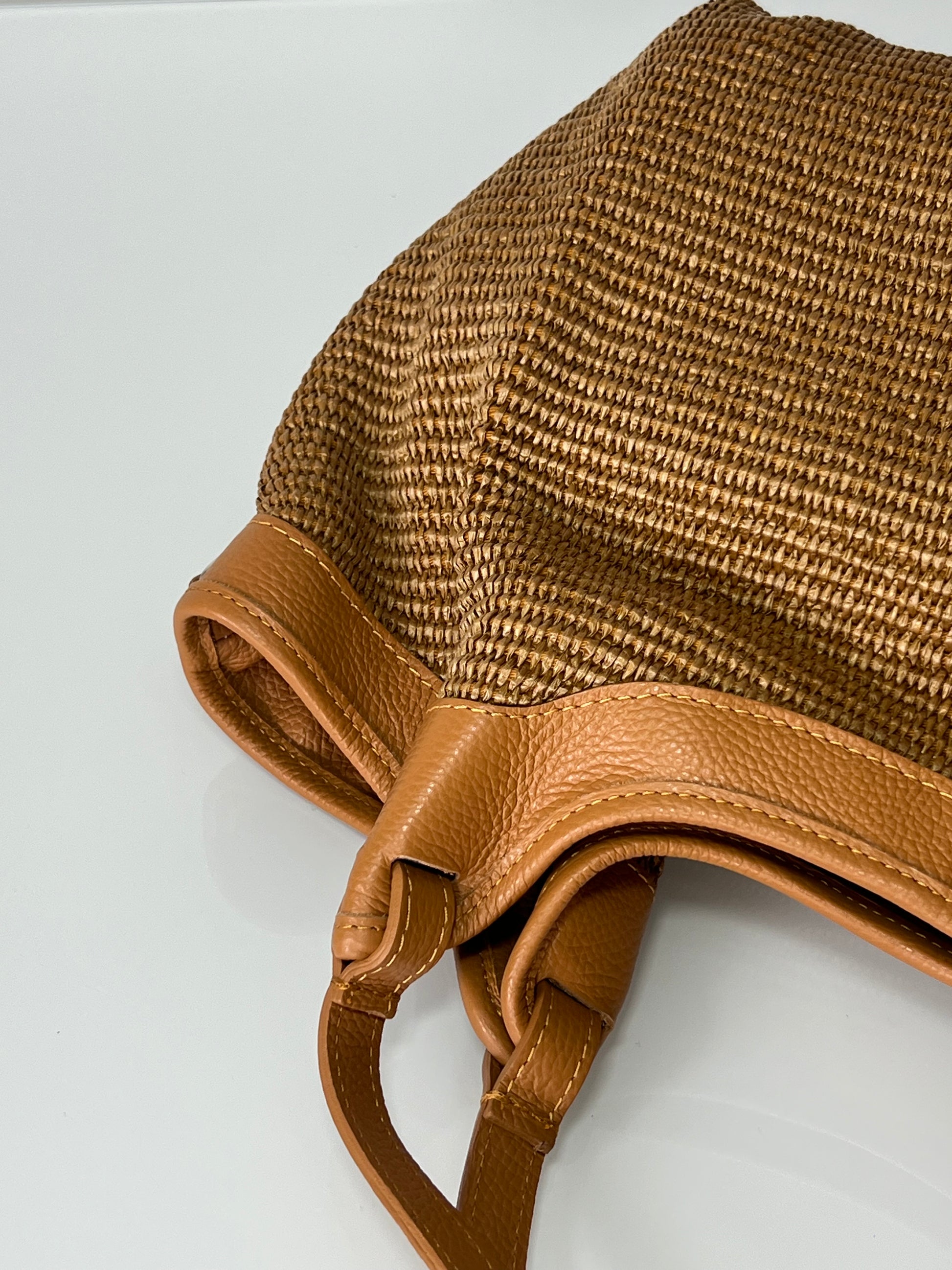 Borsa elegante e versatile realizzata in rafia con dettagli in vera pelle.