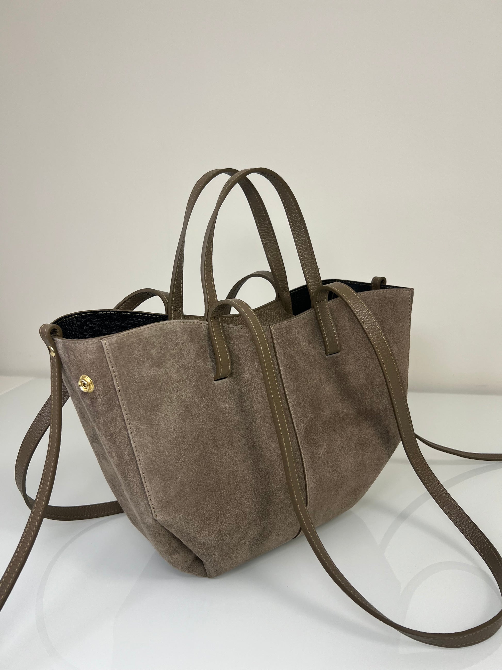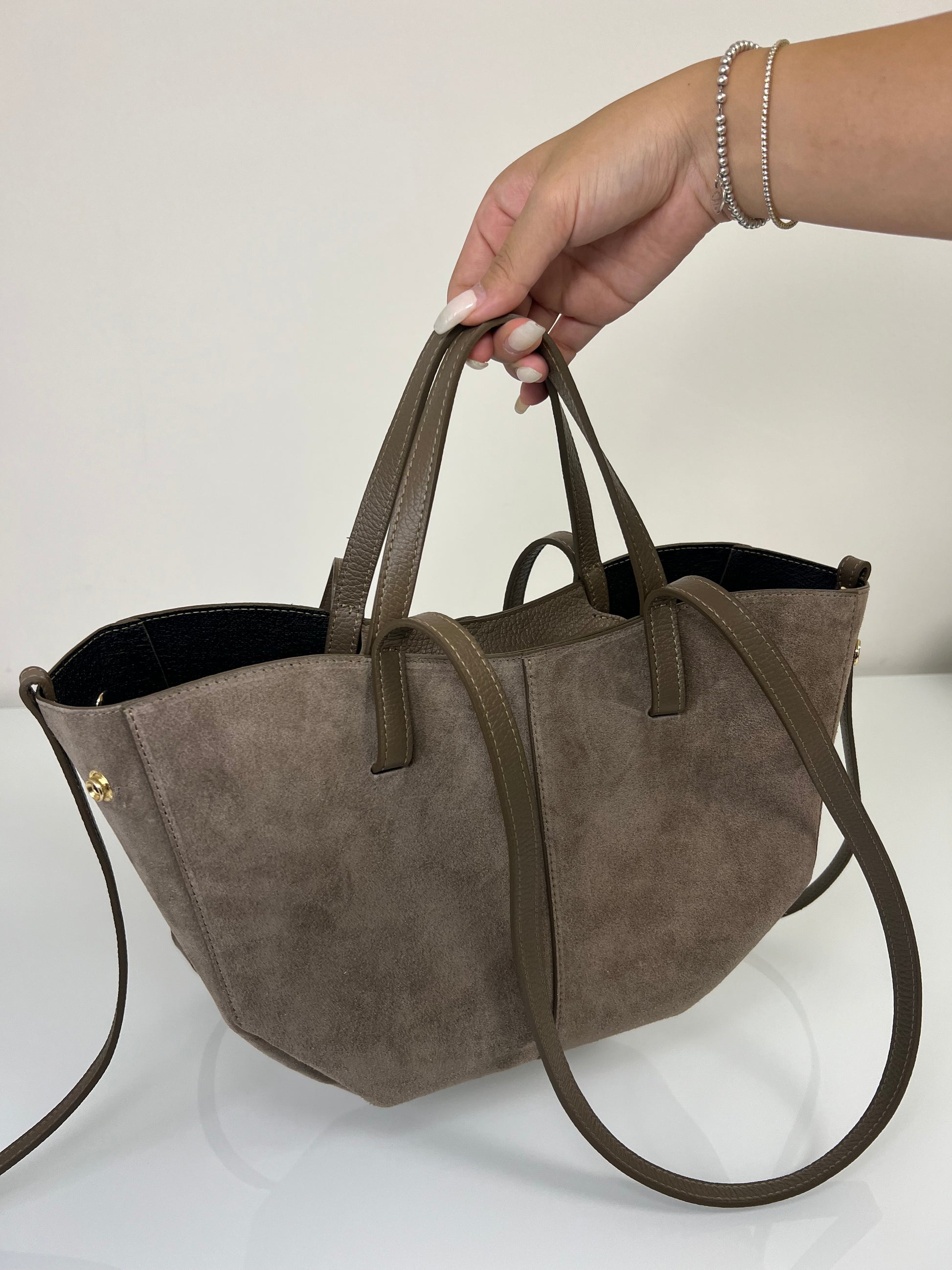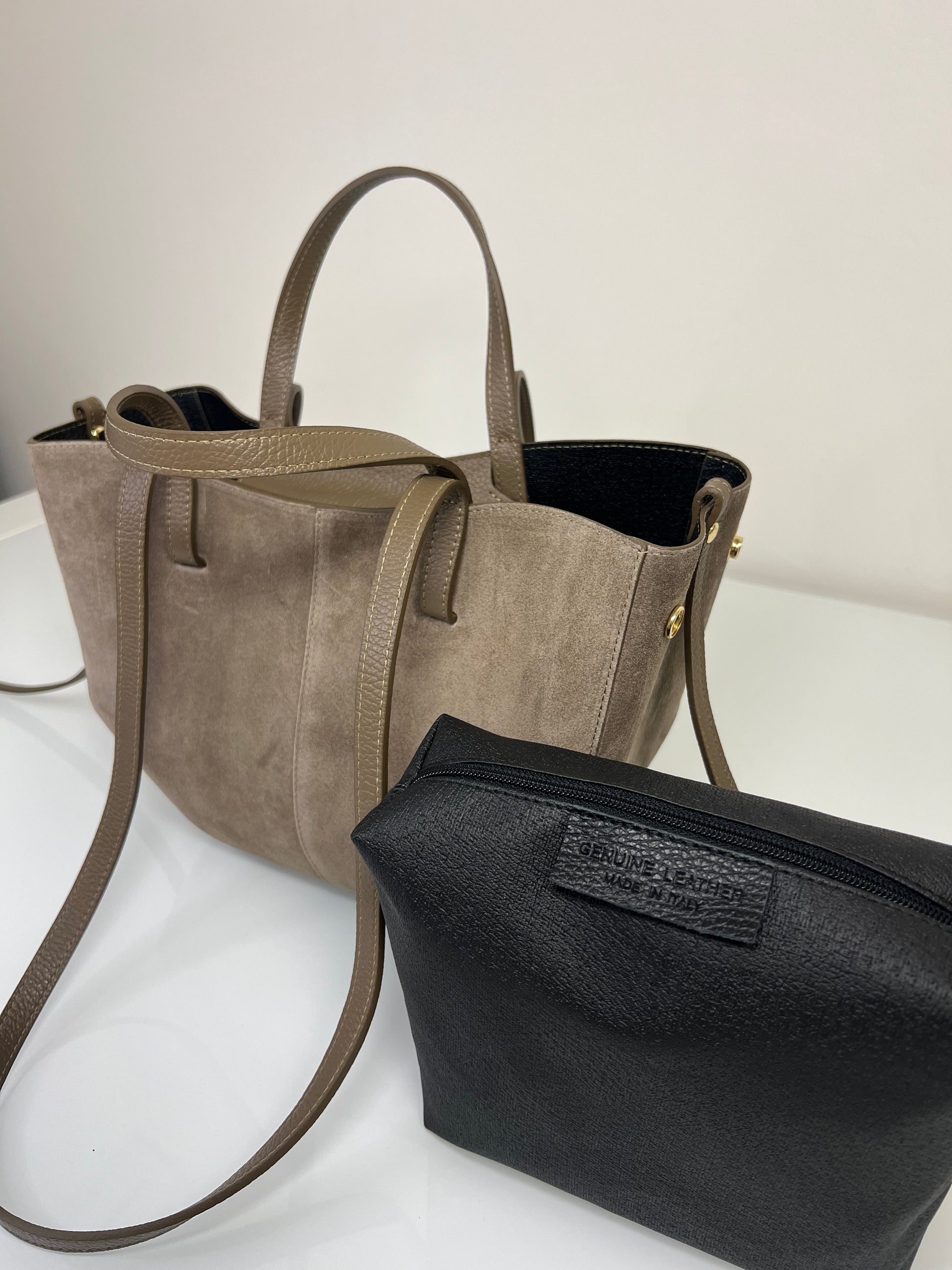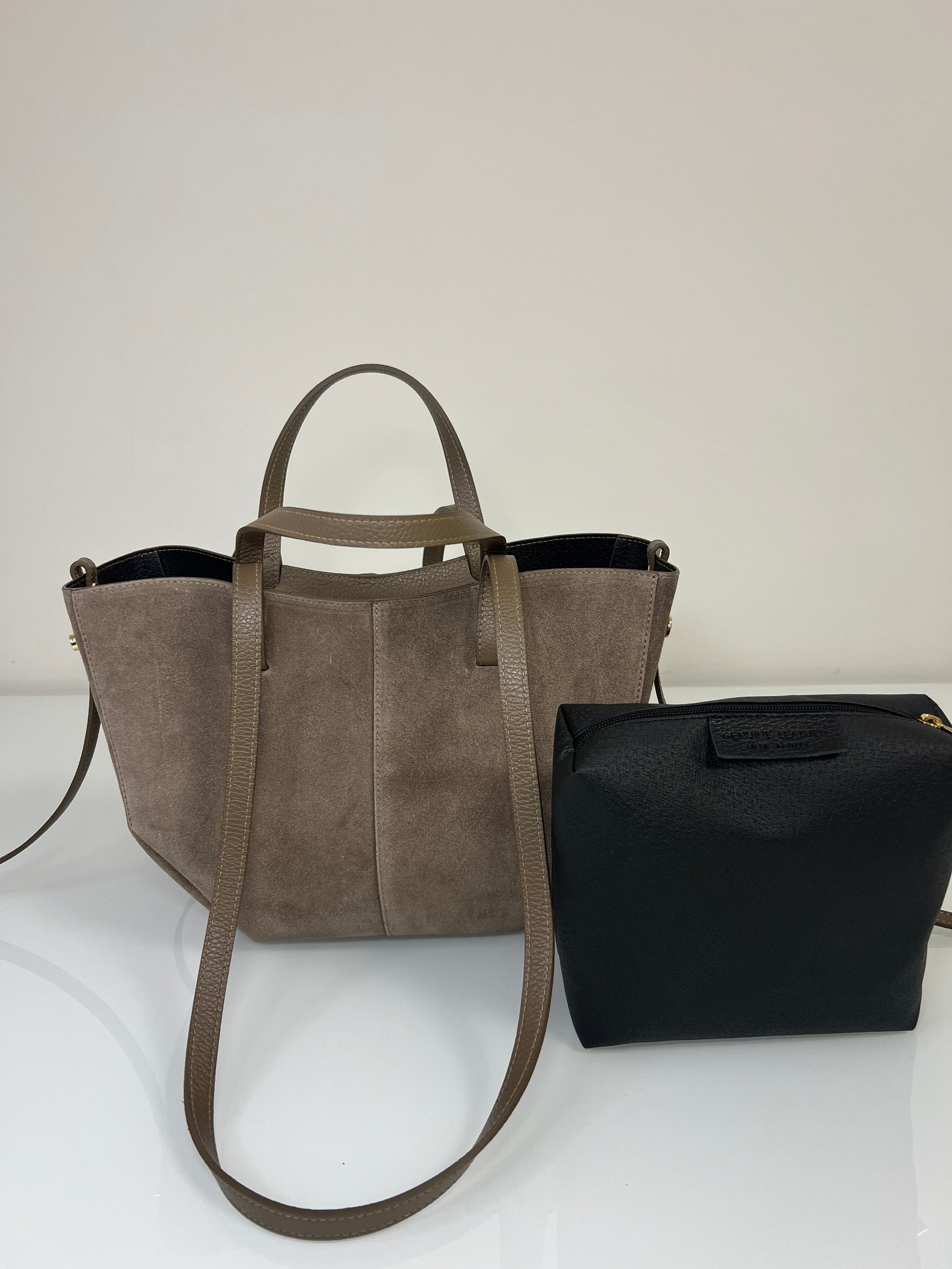 Borsa shopper in pelle scamosciata dal design minimal e sofisticato, completa di pochette interna removibile. Un accessorio pratico e chic, perfetto per accompagnarti in ogni occasione.