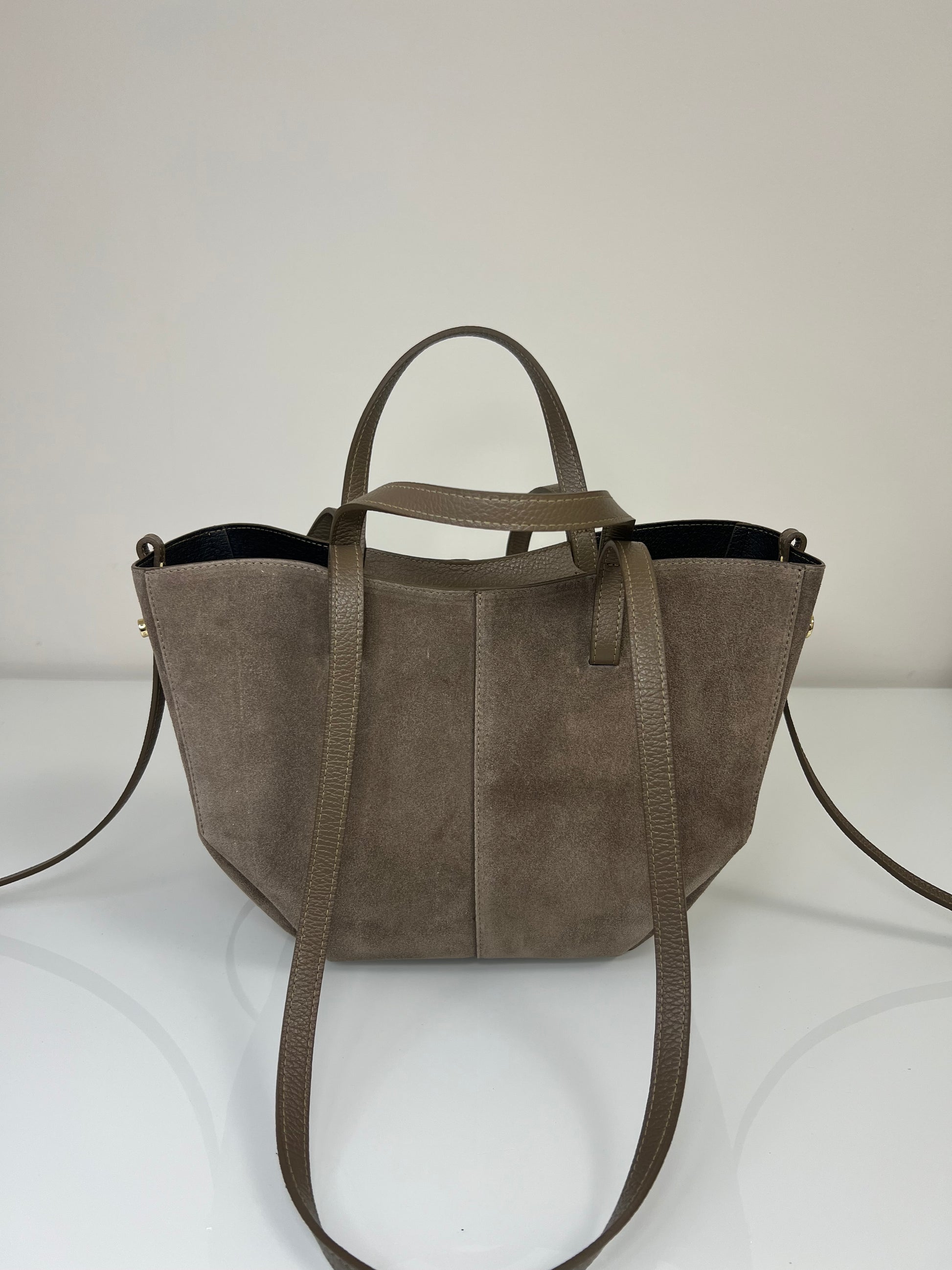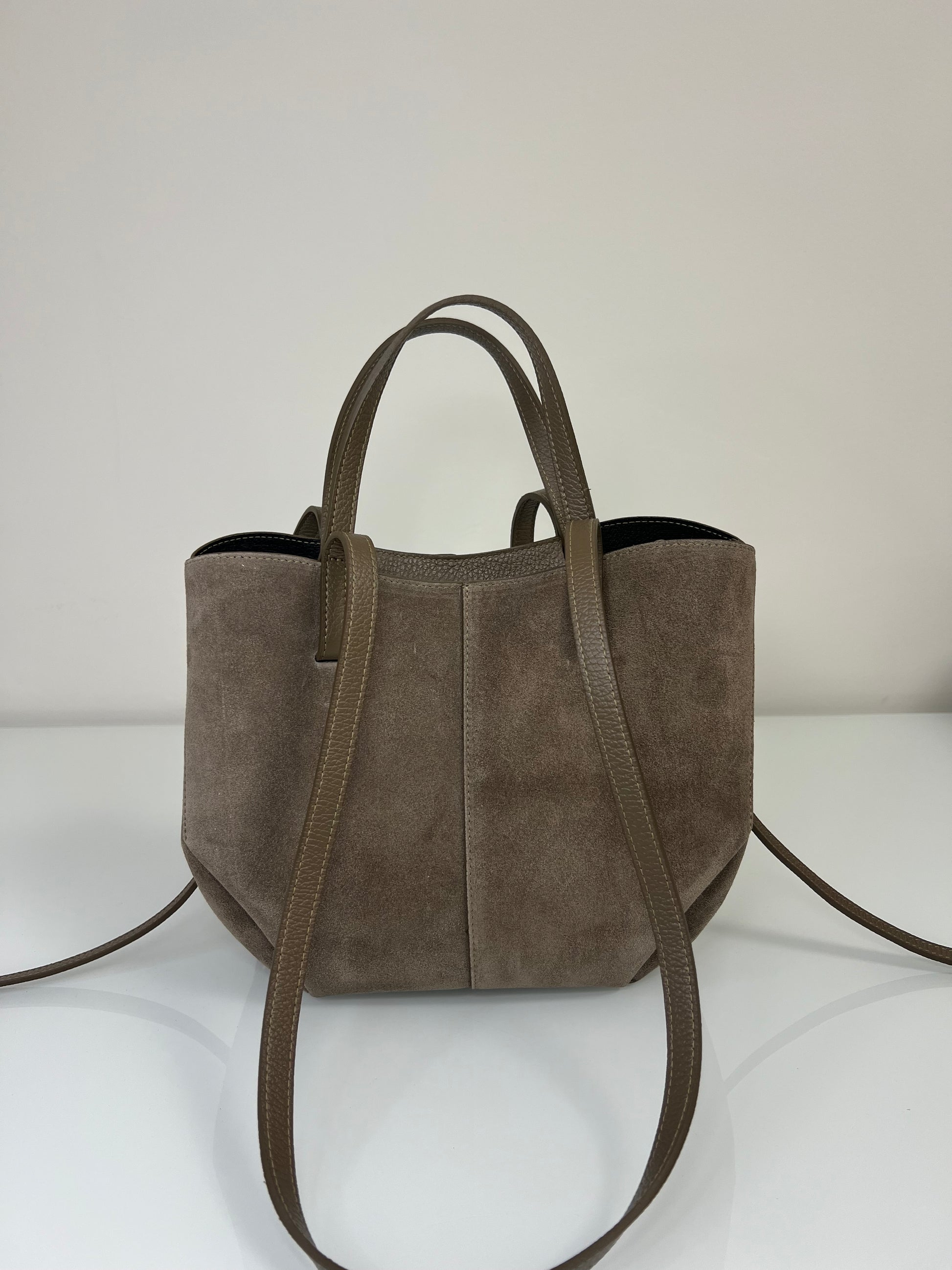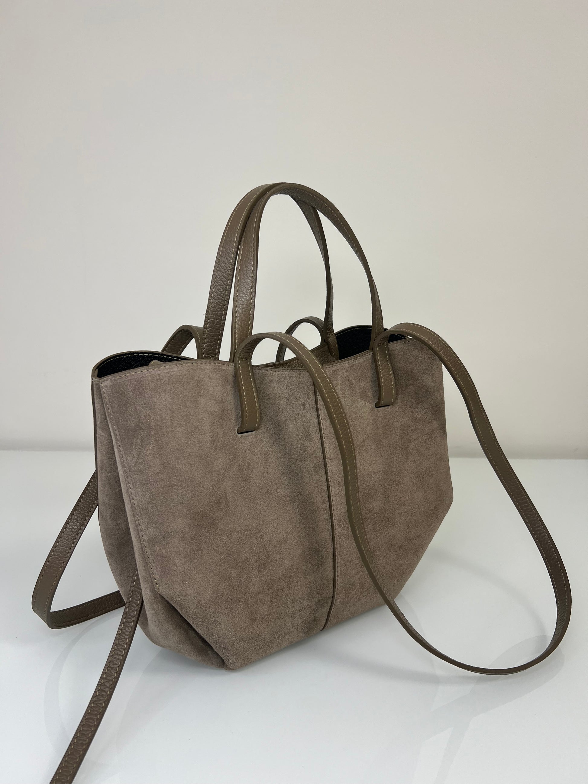 Borsa shopper in pelle scamosciata dal design minimal e sofisticato, completa di pochette interna removibile. Un accessorio pratico e chic, perfetto per accompagnarti in ogni occasione.