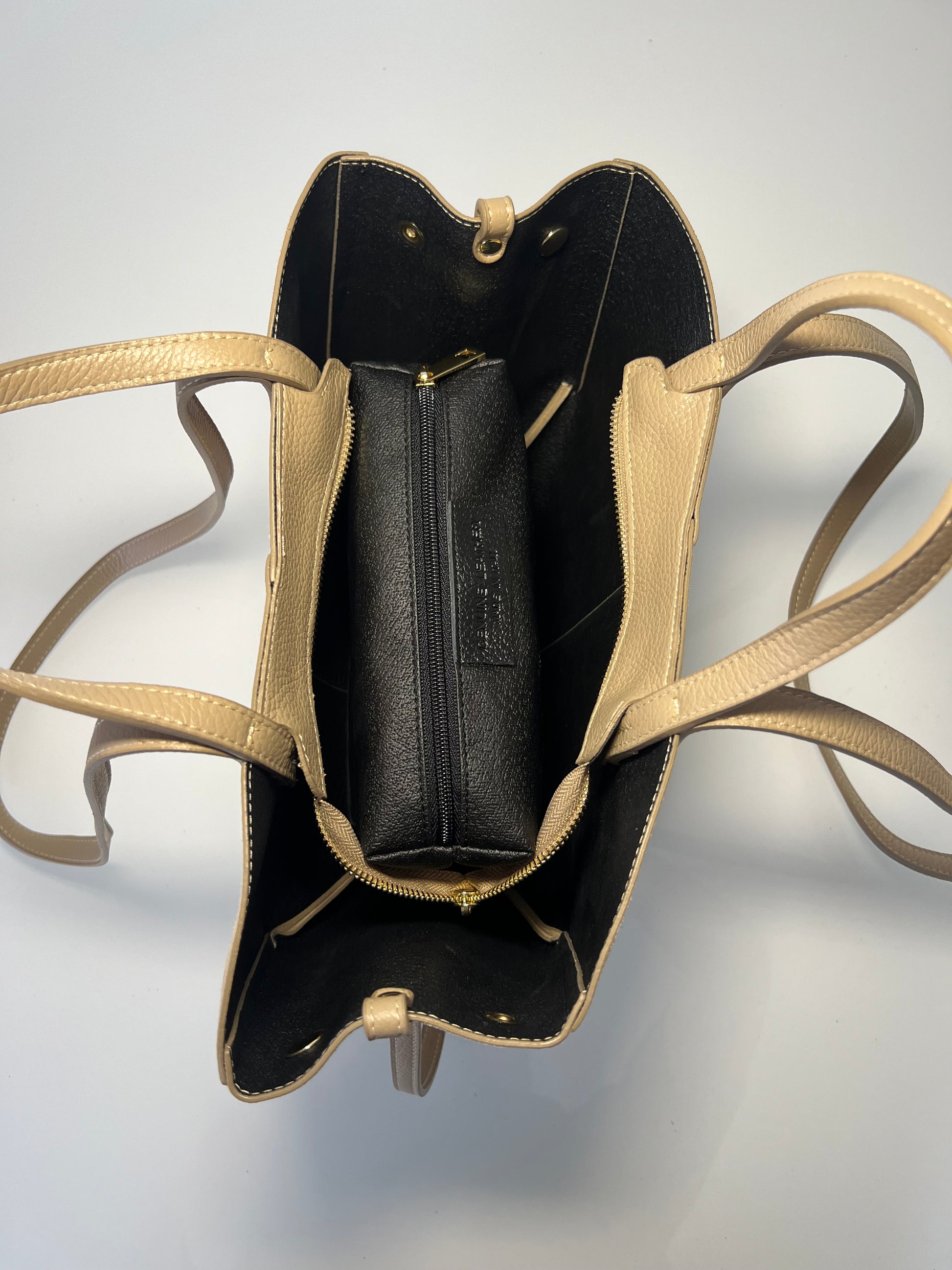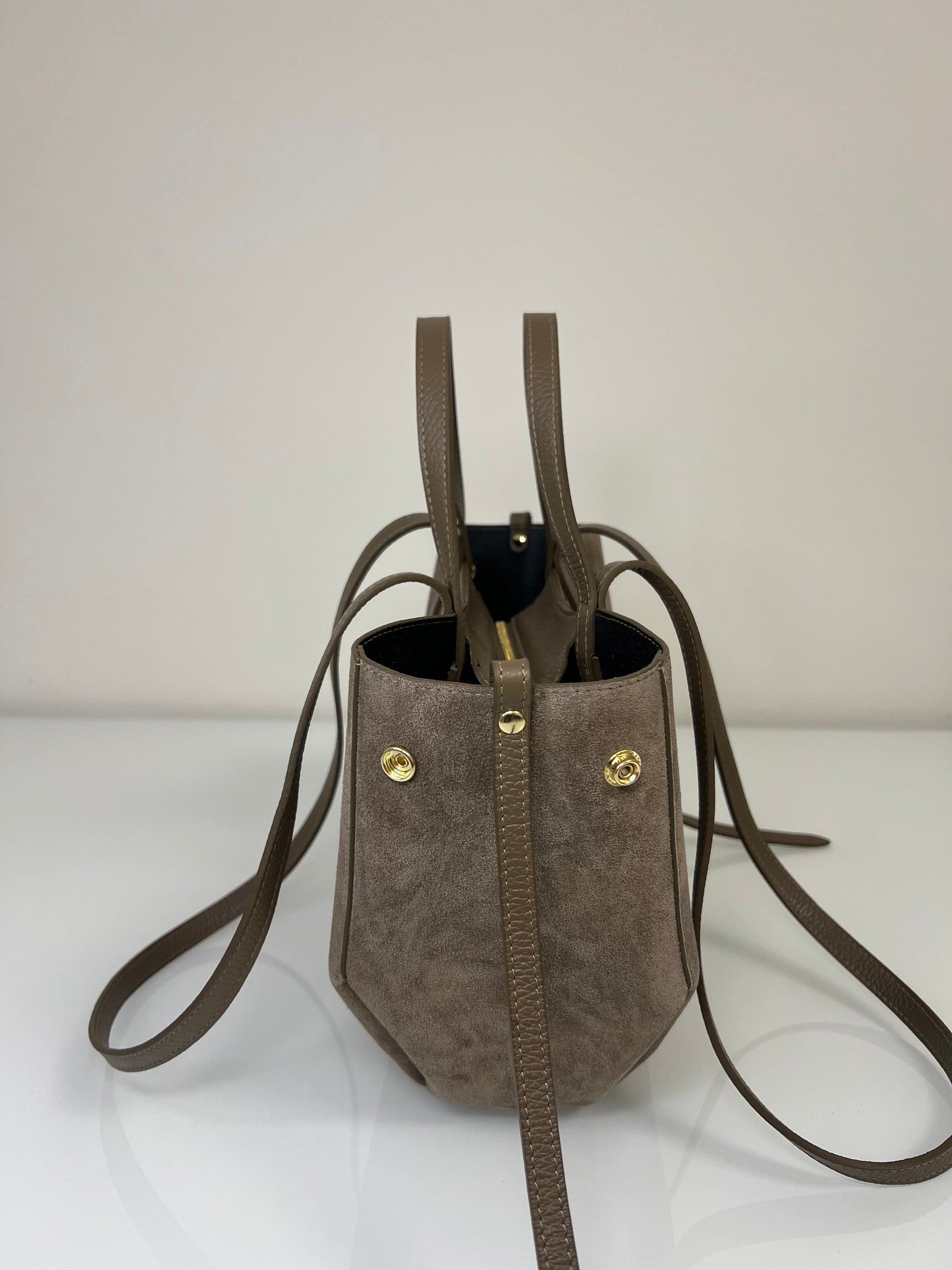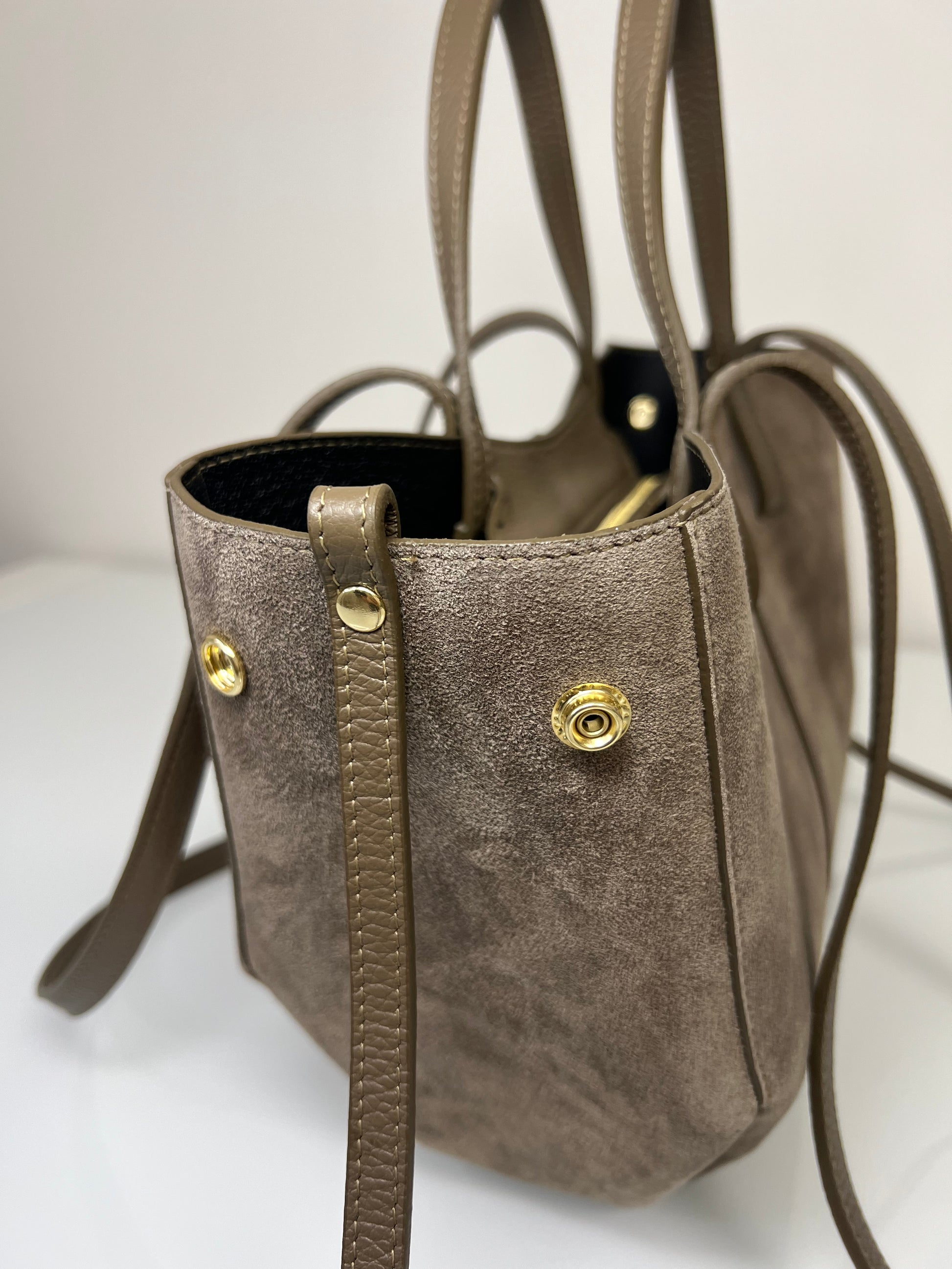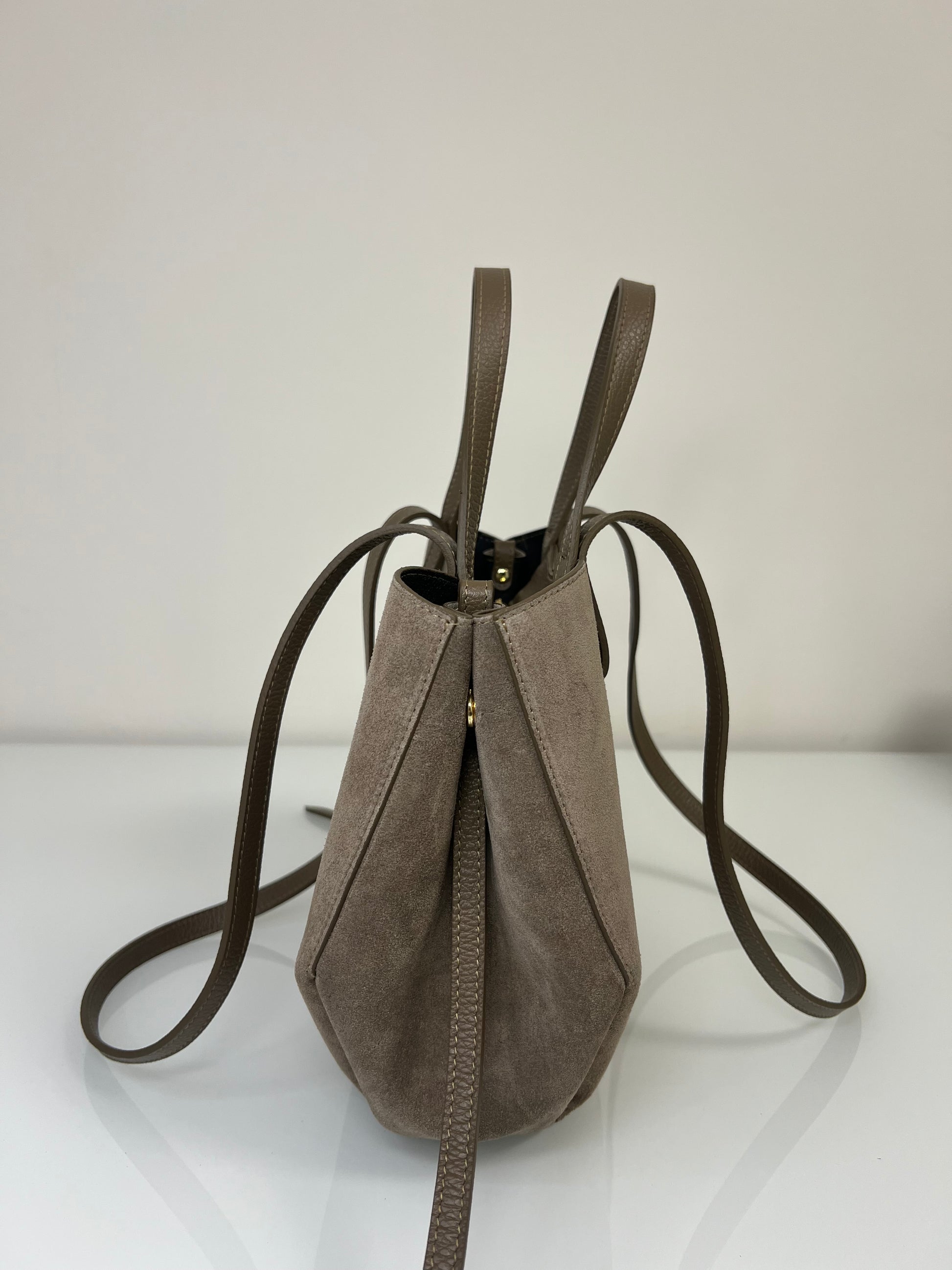 Borsa shopper in pelle scamosciata dal design minimal e sofisticato, completa di pochette interna removibile. Un accessorio pratico e chic, perfetto per accompagnarti in ogni occasione.