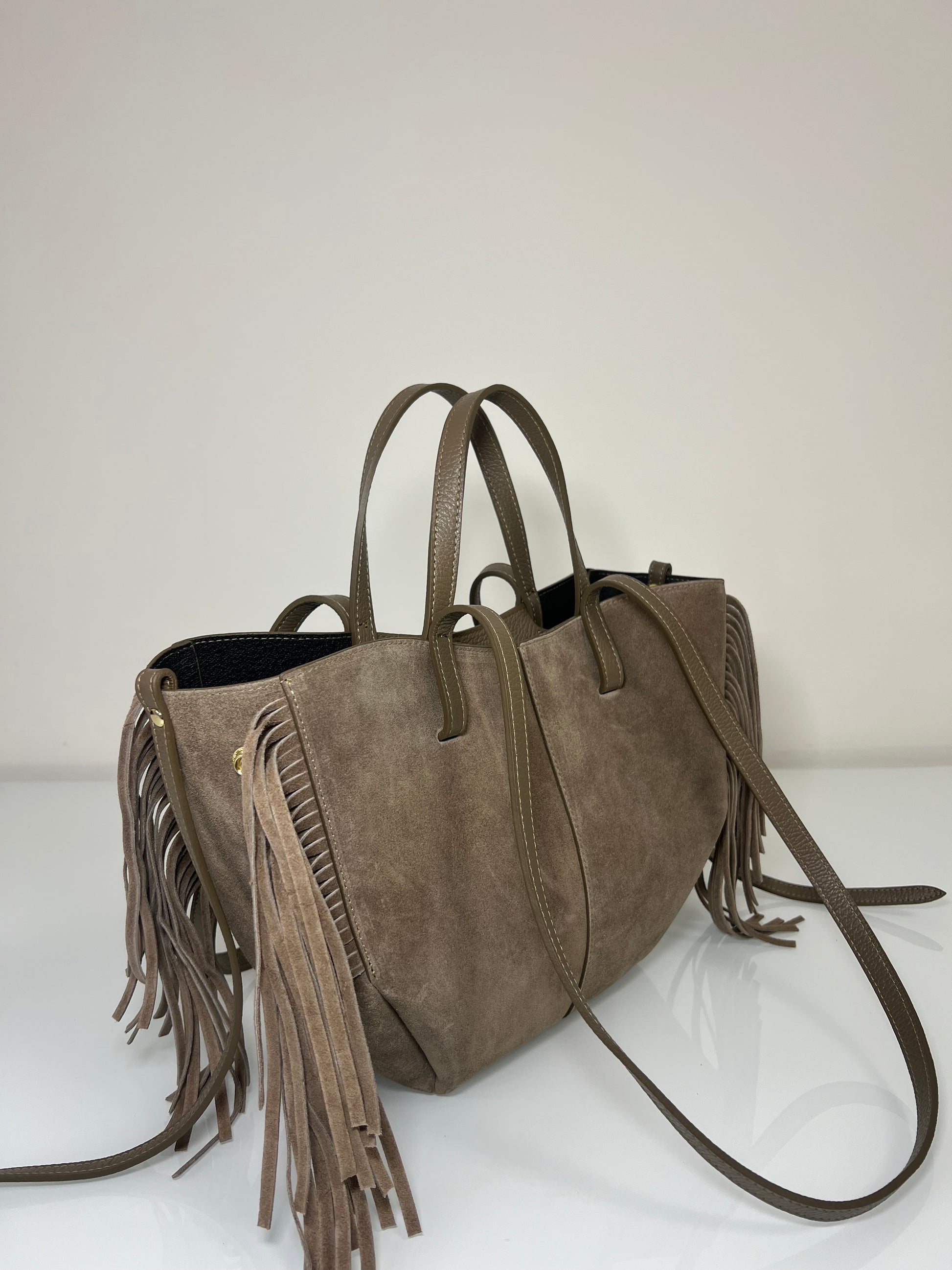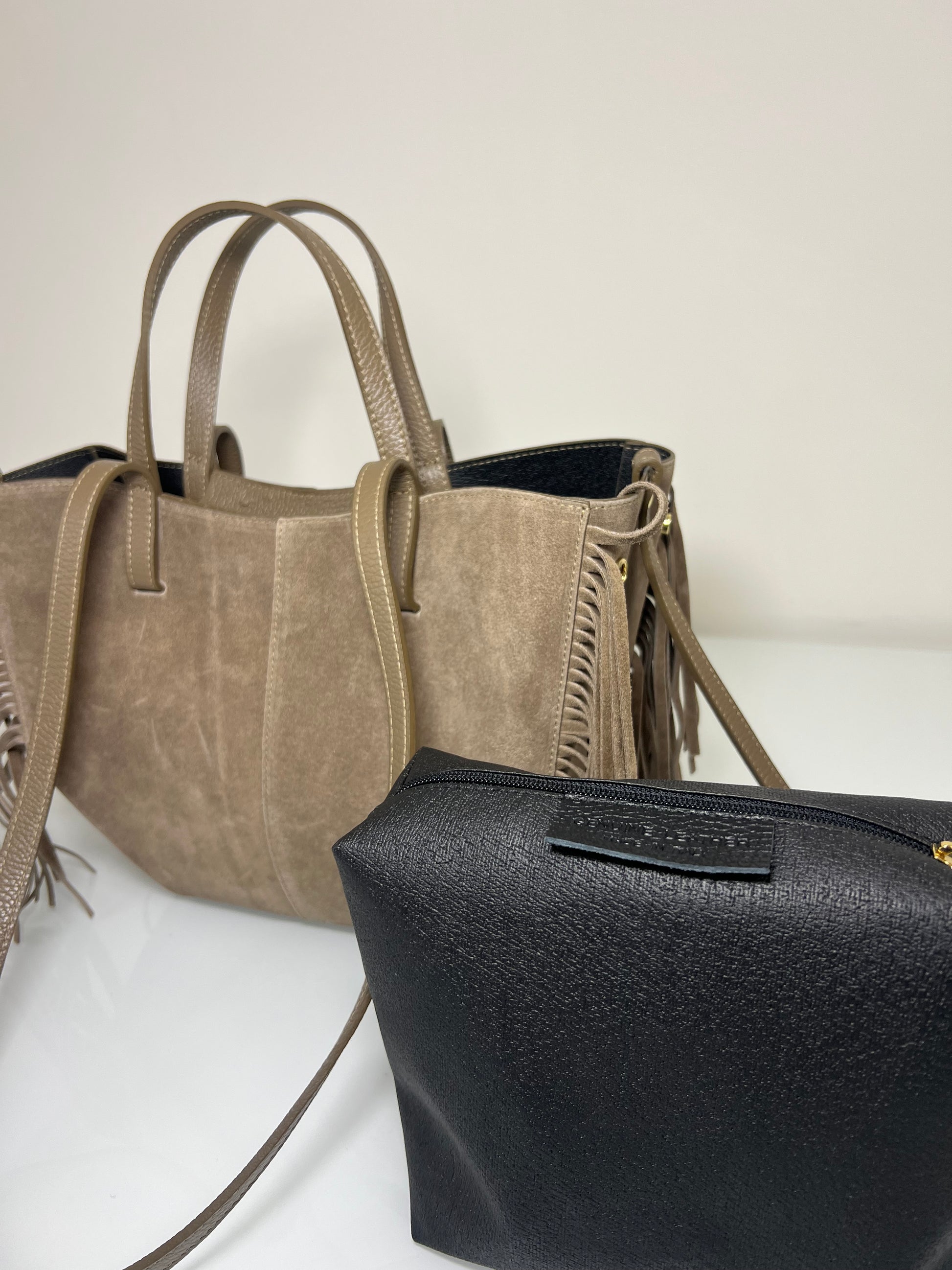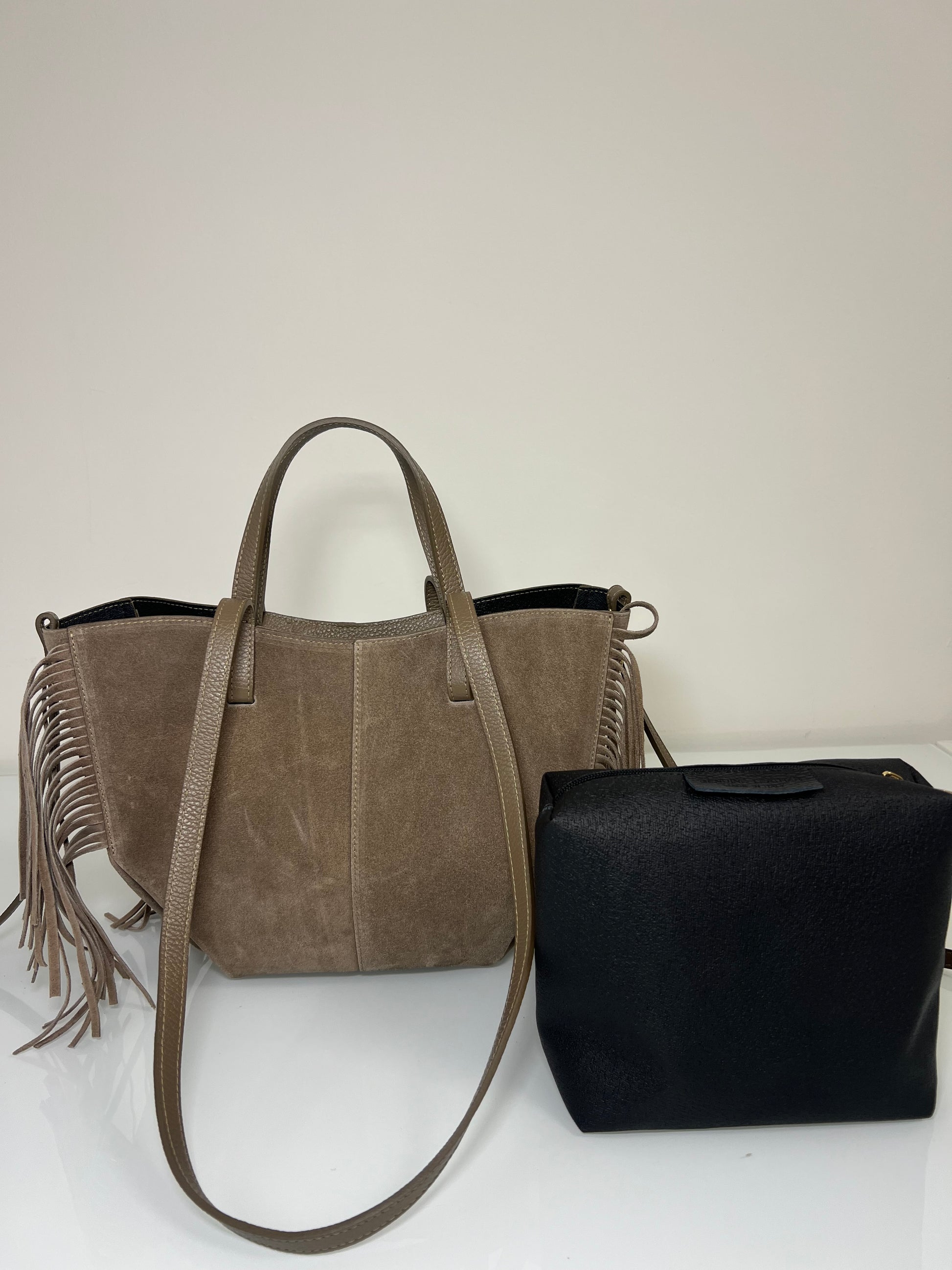 Borsa shopper in pelle scamosciata dal design minimal e sofisticato, completa di pochette interna removibile. Un accessorio pratico e chic, perfetto per accompagnarti in ogni occasione.