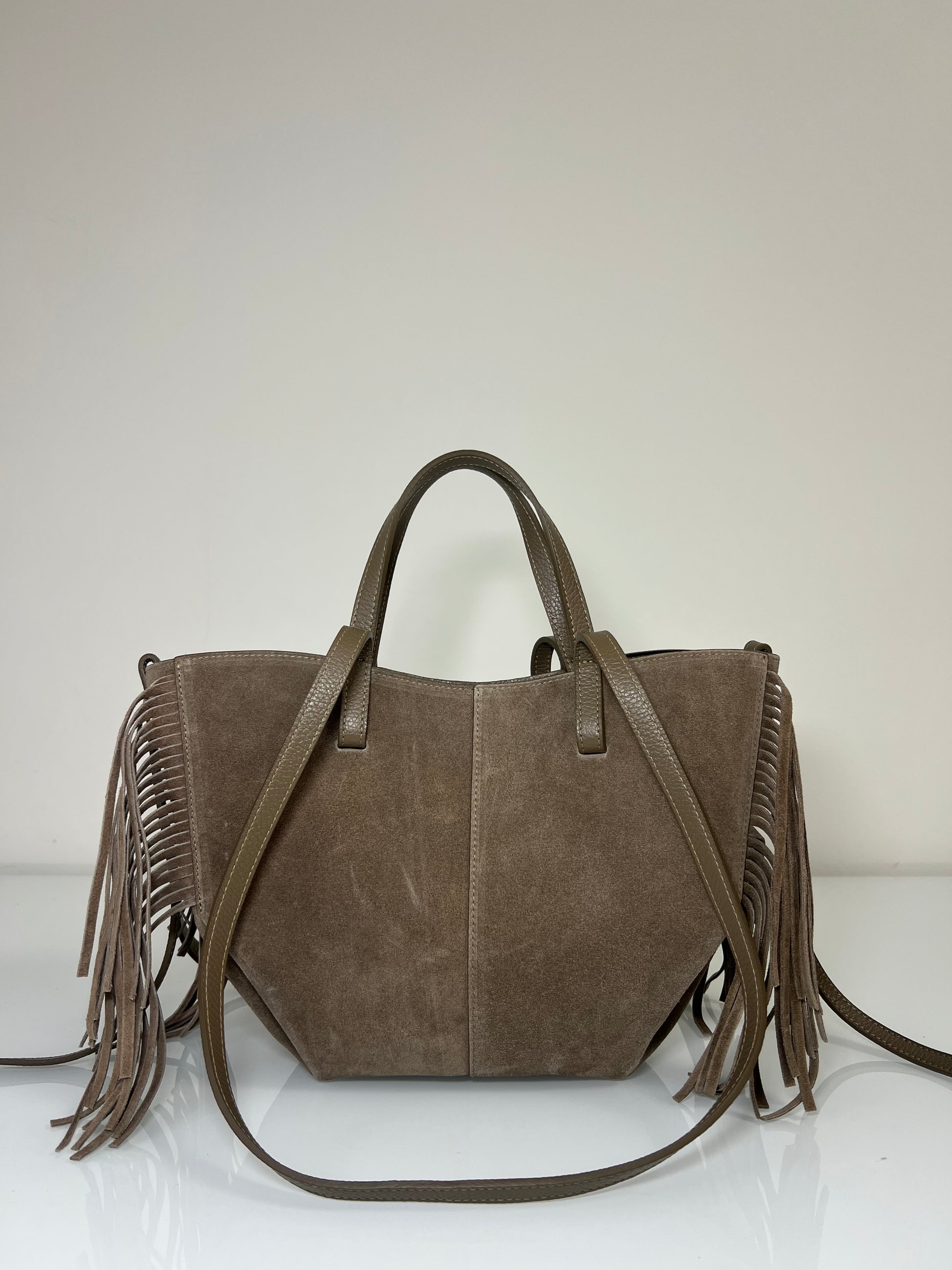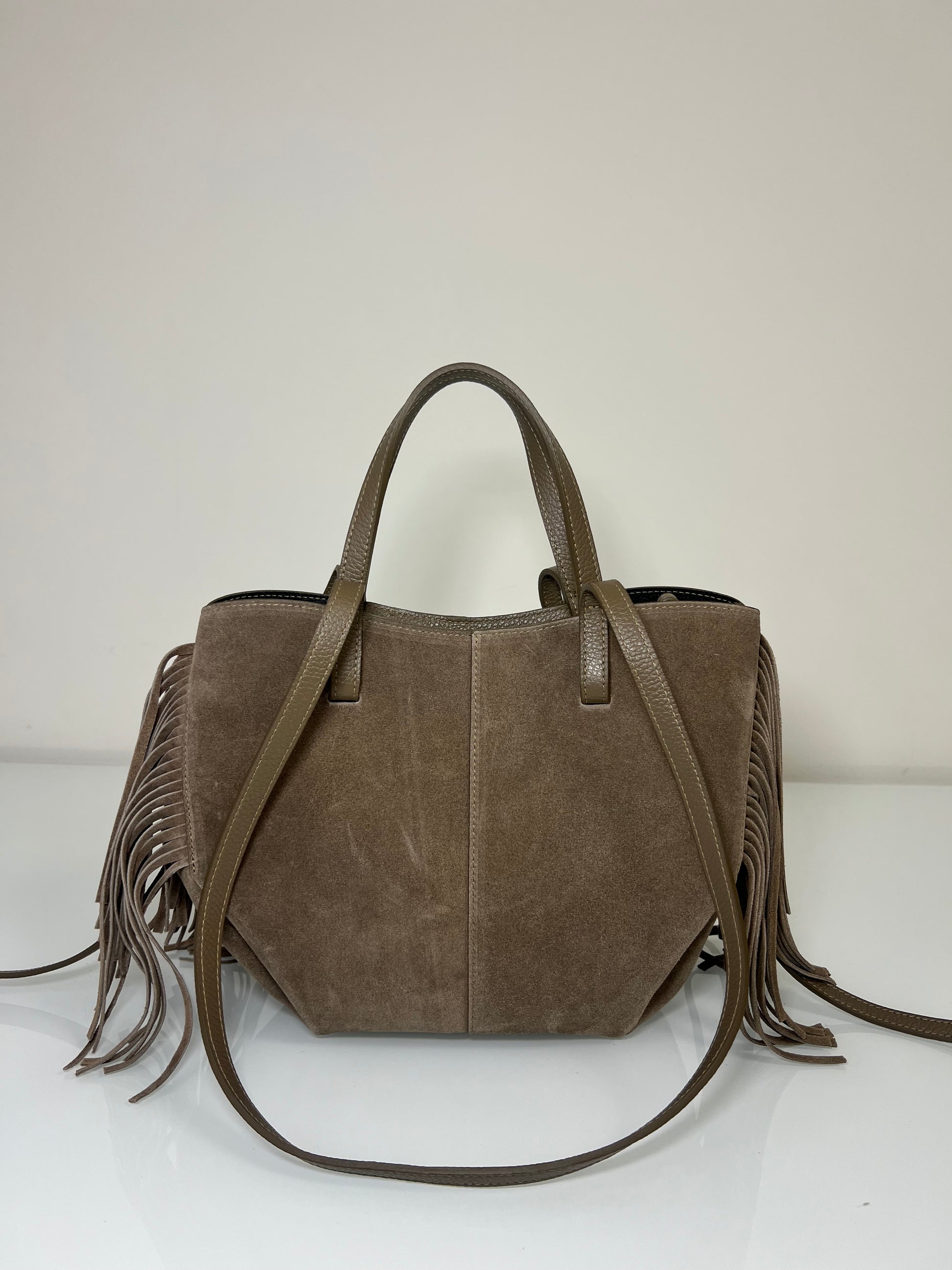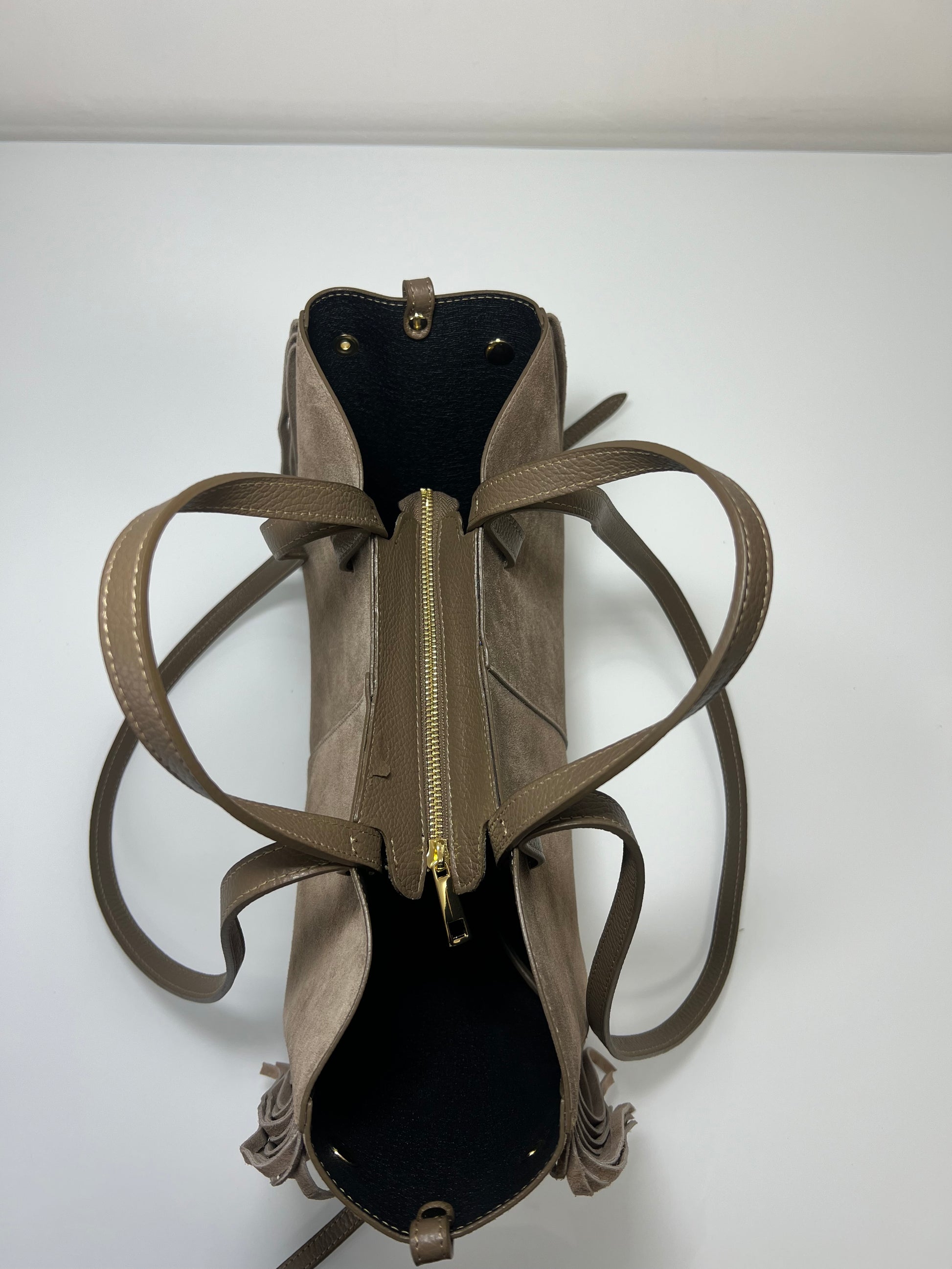 Borsa shopper in pelle scamosciata dal design minimal e sofisticato, completa di pochette interna removibile. Un accessorio pratico e chic, perfetto per accompagnarti in ogni occasione.