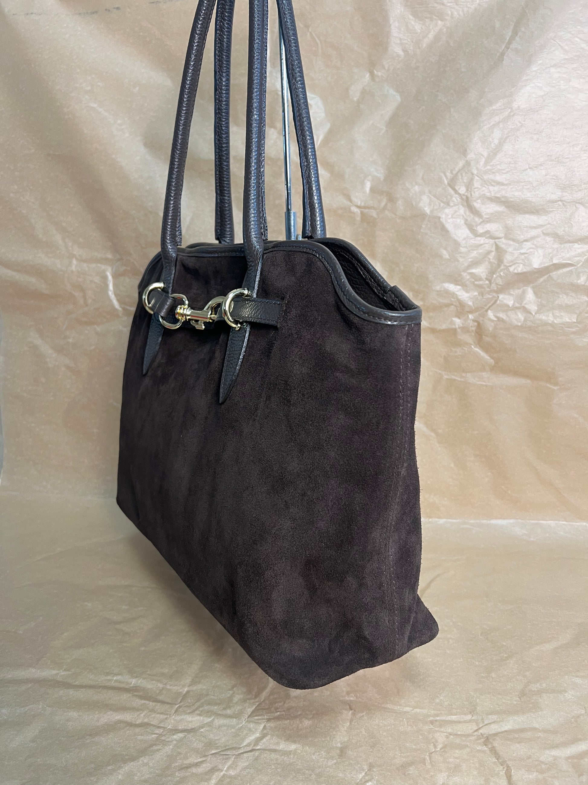 Borsa elegante in morbida pelle scamosciata, impreziosita dal caratteristico dettaglio “bit” in metallo dorato, ispirato al mondo equestre.
